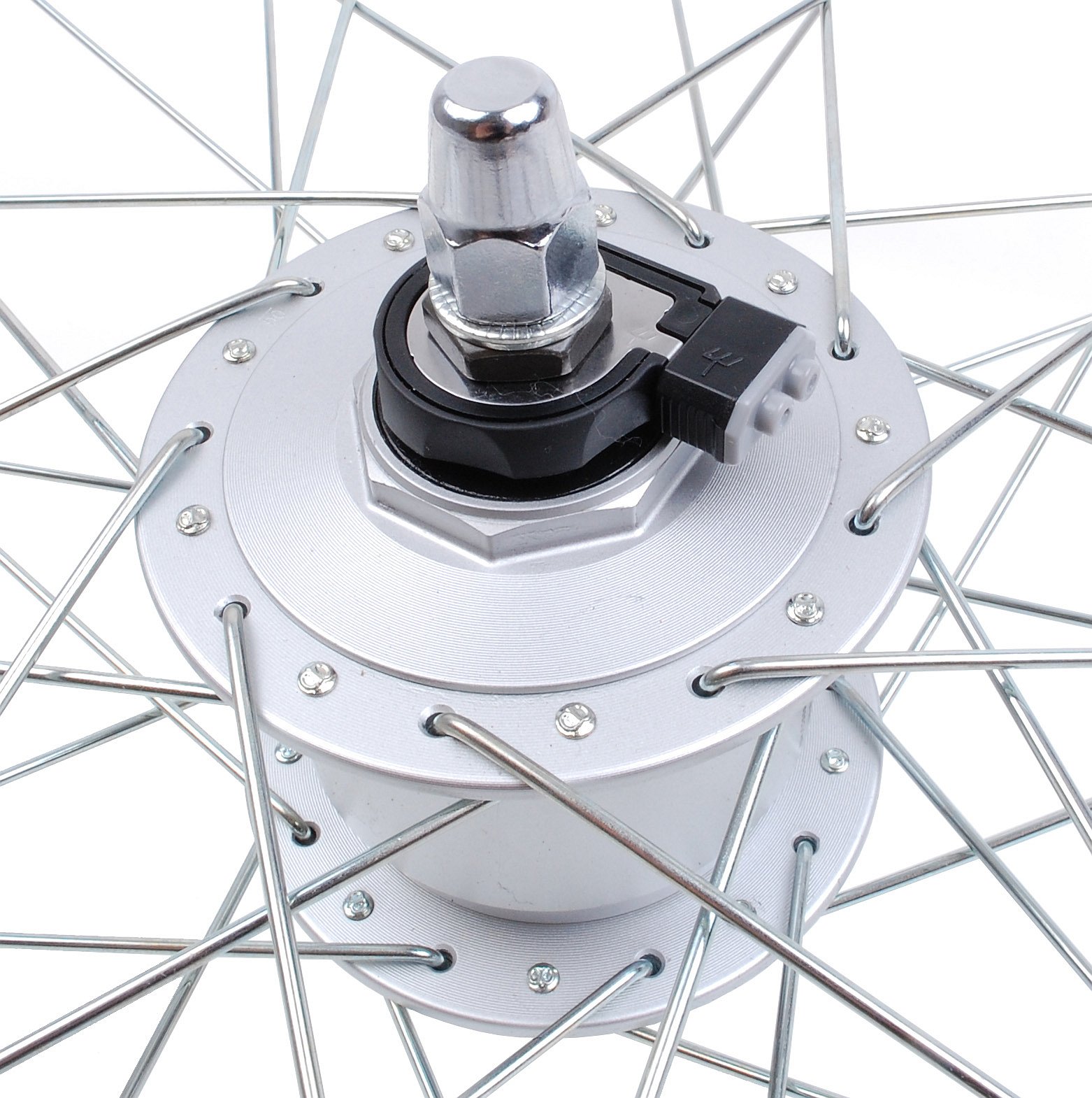 Przednie koło do roweru w rozmiarze 24" wyposażone w prądnicę Shimano Nexus o mocy 3W i napięciu 6V. Piasta nadaję się do lamp z przełącznikiem ON/OFF. Dwukomorowa obręcz Stars Circle wykonana z lekkiego stopu aluminium. Koło wyposażone w 36 szprych.