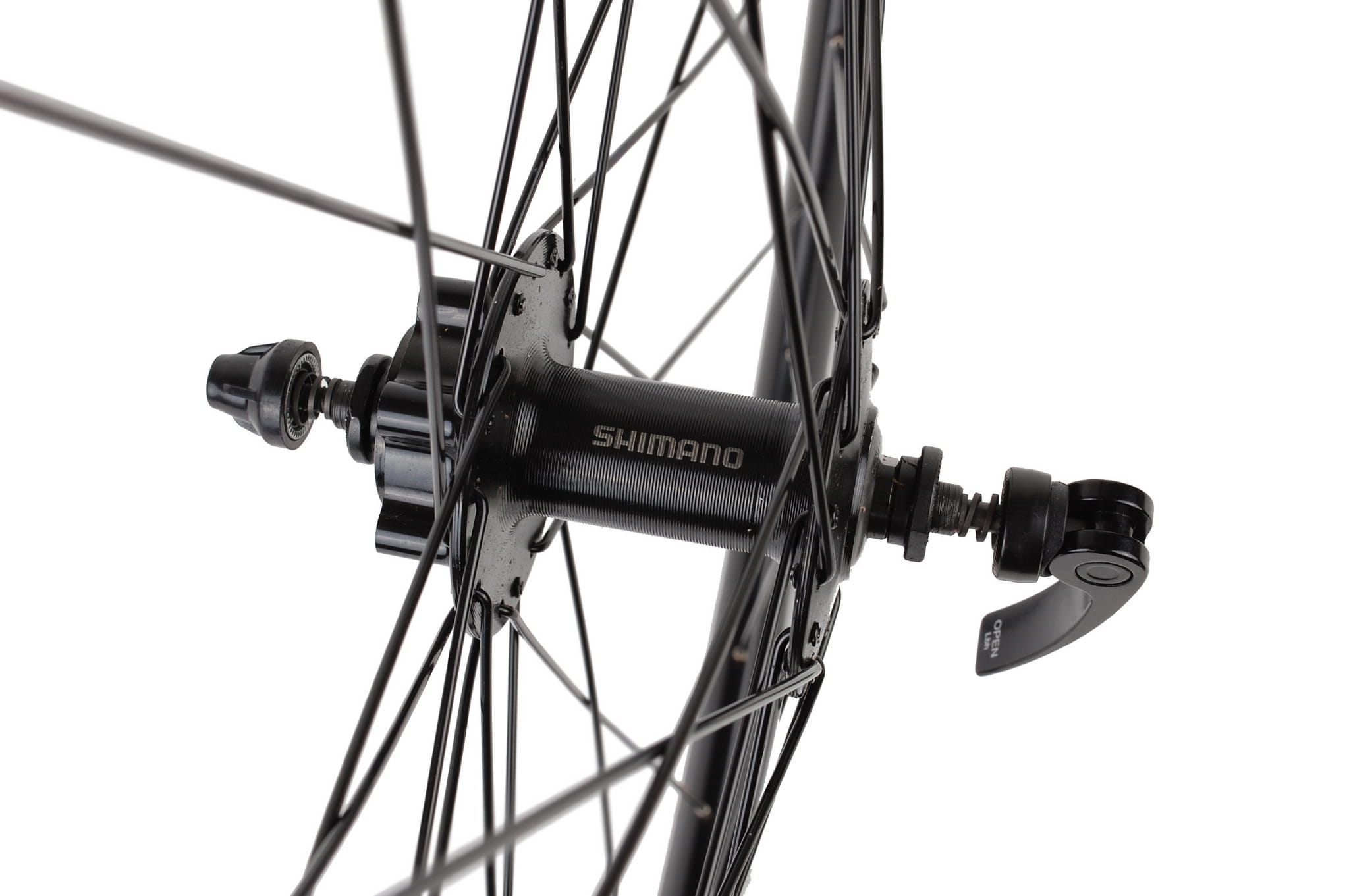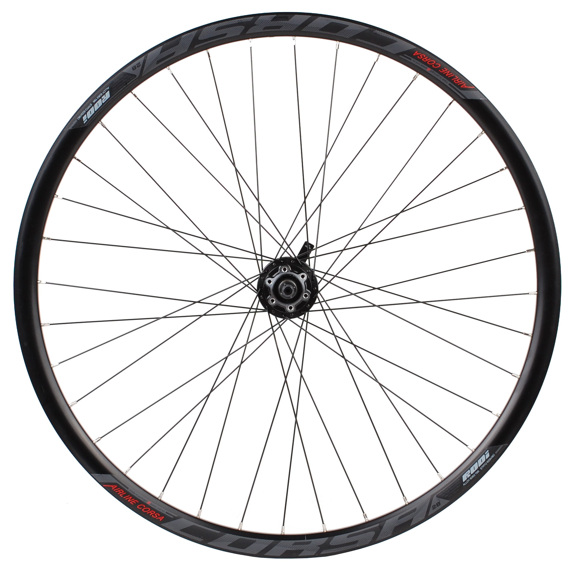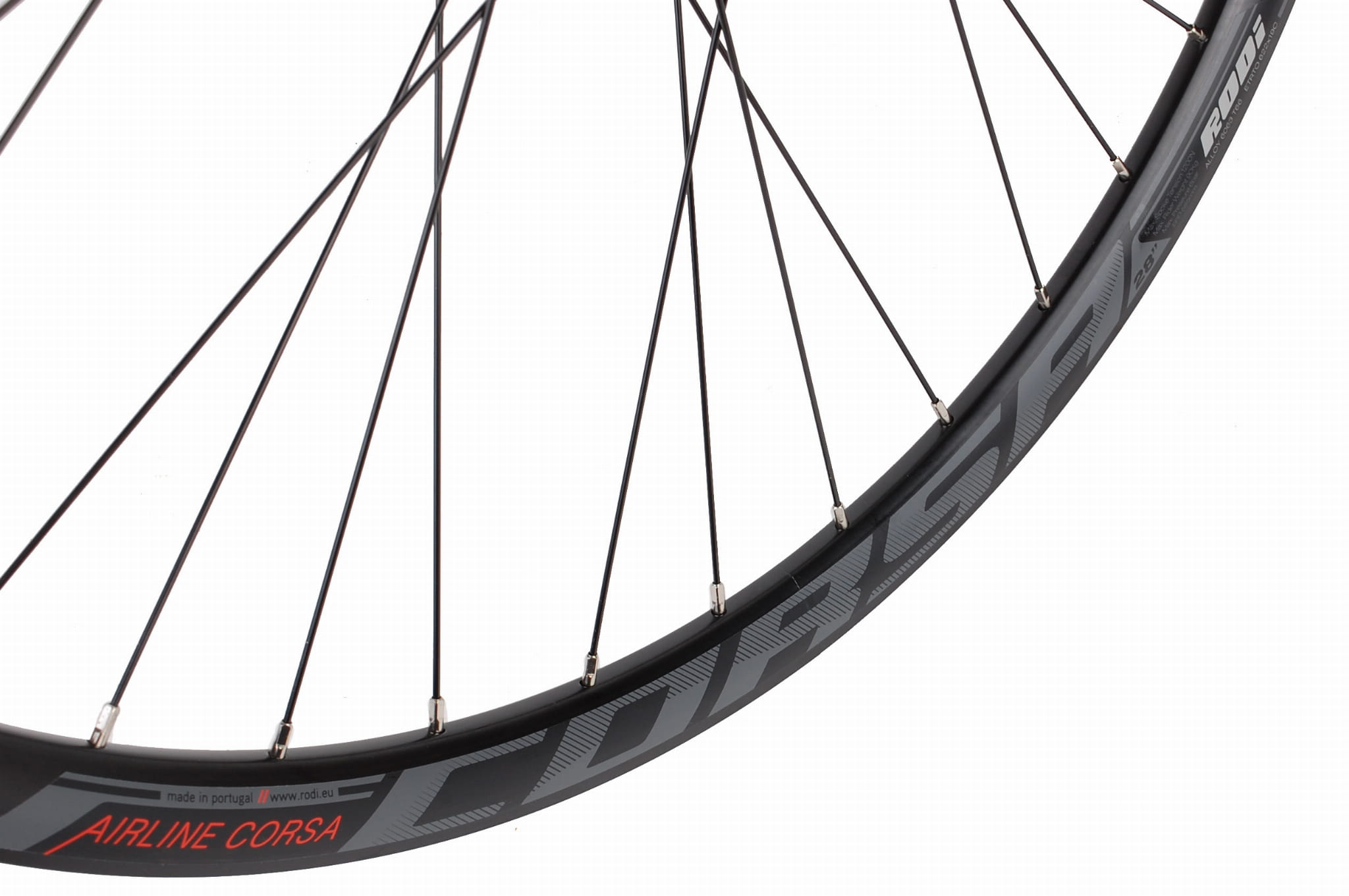 Komplet kół rowerowych w rozmiarze 28 cali zostały stworzone na wzmacnianej, aluminiowej obręczy portugalskiej firmy Rodi Airline Corsa. Koło tylne posiada bębenek piasty przystosowany do współpracy z kasetami 8/9/10 rzędowymi. Piasty Shimano na łożyskach kulkowych z mocowaniem pod hamulec tarczowy na 6 śrub, w zestawie znajdują się zaciski. Mosiężne nyple firmy Sapim wraz z 36 ocynkowanymi szprychami.