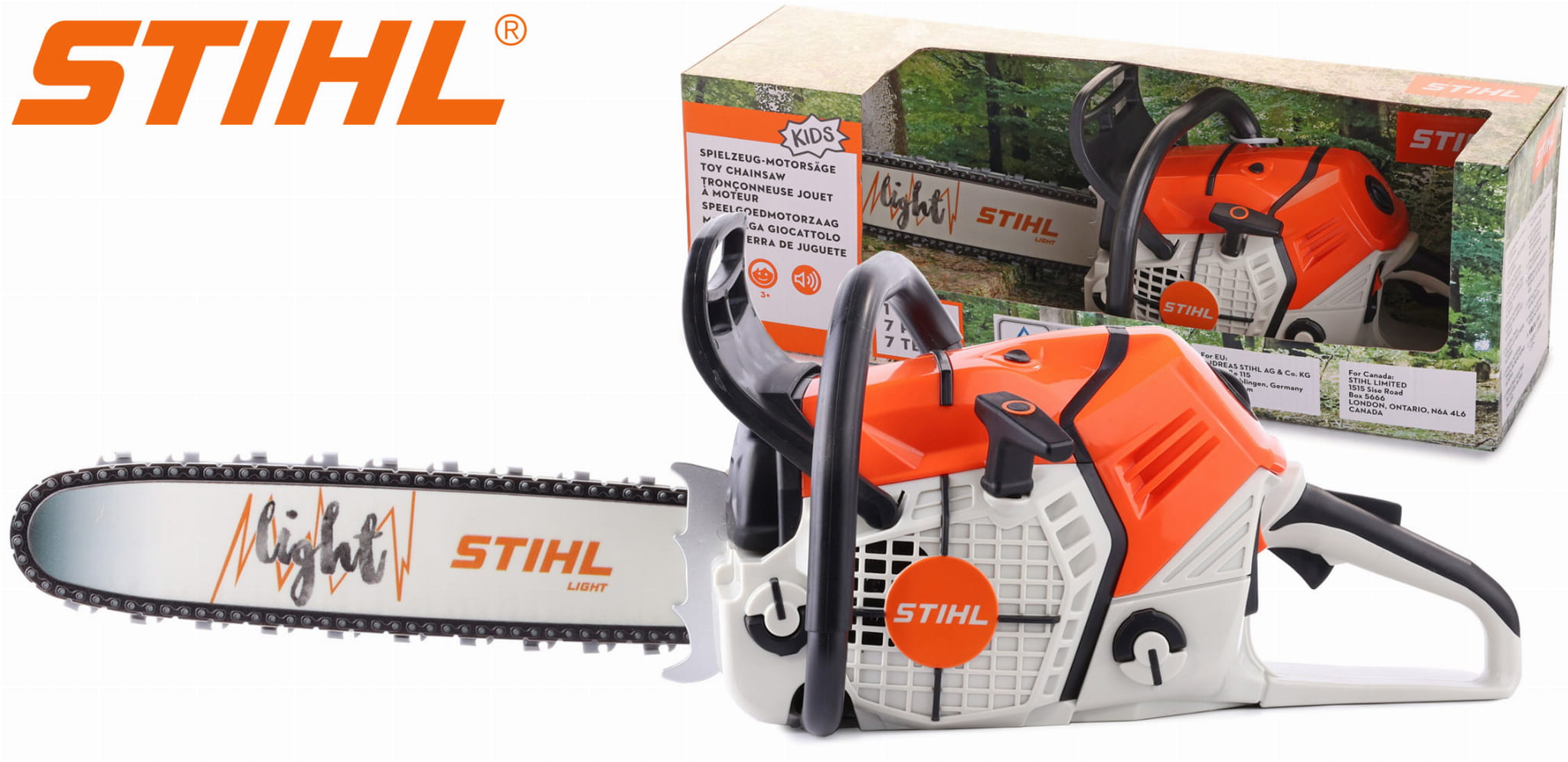 Oryginalna miniaturowa pilarka łańcuchowa Stihl - zabawka dla dzieci. Imituje odgłosy prawdziwej pilarki, a obracający się gumowy łańcuch sprawia, że zabawa dziecka staje się prawdziwą przygodą. Piła zasilana jest 3 bateriami AA, które znajdują się w zestawie. Zabawka zaczyna wydawać dźwięki pracującej pilarki po pociągnięciu za sznurek rozrusznika. Po dodaniu gazu gumowy łańcuch się obraca. Pilarka pozwala na regulację głośności dźwięku. Możemy wymienić gumowy łańcuch (drugi w zestawie) przy pomocy załączonego klucza.